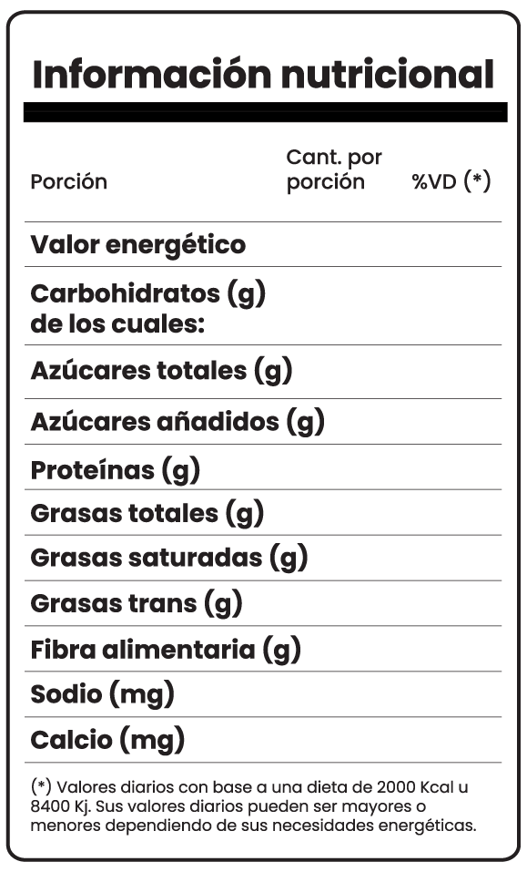 Detalla la información nutricional del alimento como el aporte energético (calorías) y el contenido de nutrientes, tales como: carbohidratos, proteínas, grasas, azucares totales, azúcar agregada, fibra alimentaria, sodio y calcio. Los valores están expresados por porción de consumo, que varían según el producto. Por ejemplo: «Porción 30g o 6 galletitas”.La tabla nutricional